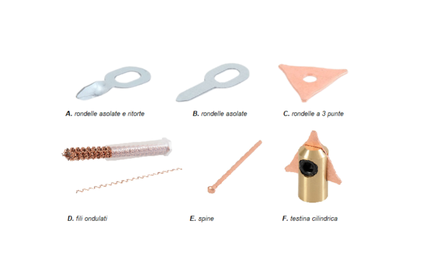 Tipologia | FILI ONDULATI 2×315 IN ACCIAIO RAMATO CONF. 50 PEZZI, RONDELLE A TRE PUNTE RAMATE CONF. 50 PEZZI, RONDELLE ASOLATE CONF. DA 50 PEZZI S. 1, RONDELLE ASOLATE E RITORTE CONF. DA 50 PEZZI S. 1,5, SPINE 2×50 IN ACCAIO RAMATO CONF. DA 100 PEZZI, TESTINA CILINDRICA PER RONDELLE A TRE PUNTE |