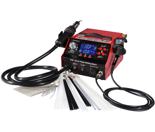 l saldatore per la plastica Duojob è una soluzione funzionale, pratica e di qualità che coniuga una efficiente saldatura ad aria calda con la saldatura a resistenza in ceramica in un’unica e comoda soluzione. Non avrai necessità di bombole in quanto il saldatore lavora ad aria calda. Ideale per riparazioni rapide e resistenti di materiali termoplastici fusibili come polipropilene (PP), polietilene (LDPE e HDPE), ABS e molti altri. Con la torcia a resistenza in ceramica potrai riparare poliuretano termoindurente (PUR) e materiali termoplastici in generale. Utilizzato anche per la fusione di reti metalliche di rinforzo in acciaio inox. Il saldatore ad aria calda è dotato di controllo regolabile del flusso d’aria; raffreddamento e spegnimento automatici per garantire la sicurezza. Sia il saldatore ad aria calda che quello a resistenza sono dotati di controllo della temperatura: impostando la temperatura desiderata, i saldatori si regolano automaticamente. Include bacchette in sette diversi materiali plastici per la riparazione delle più comuni plastiche automobilistiche. I materiali PP, LDPE e HDPE vengono forniti anche con bacchette a nastro di 9,5 mm di larghezza per una maggiore area di contatto e riparazioni più resistenti. Include bacchetta per saldatura in uretano, utilizzata per riparare i vecchi paraurti in poliuretano (PUR) dagli anni ’70 agli anni ’90. Rafforzate la riparazione fondendo la rete di rinforzo in acciaio inox direttamente nella plastica.
