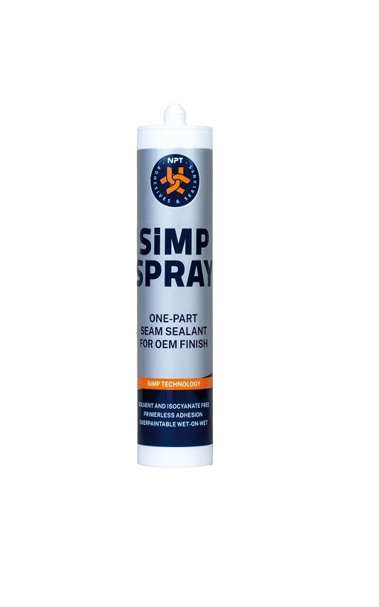 SiMP Spray è un adesivo e sigillante monocomponente SiMP – Silyl Modified Polymer per applicazione a spruzzo o anche a cordolo nella riparazione della carrozzeria automobilistica e nell’assemblaggio industriale. Indurisce sotto l’influenza dell’umidità atmosferica per formare un adesivo elastico permanentemente flessibile ad alte prestazioni. Privo di solventi e isocianati. CAMPI DI APPLICAZIONE SiMP Spray è un versatile adesivo e sigillante specifico per applicazioni a spruzzo sia per giunti che per la riproduzione di rifiniture originali. Utilizzato nei giunti sovrapposti o saldati nell’industria automobilistica e nella costruzione e riparazione di carrozzerie, treni, veicoli industriali e container; contribuisce anche alla protezione contro la corrosione. HA eccellenti proprietà di adesione senza primer su metalli, superfici verniciate, alluminio, PVC, plastiche rinforzate con fibra di vetro, ABS, policarbonato e materiali plastici in genere.